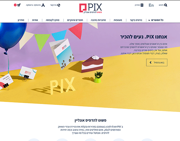 עיצוב אתר מהפכני למותג פיקס מבית דפוס בארי, המאפשר לכם לבחור ערכת עיצוב קיים (שגם אותם דאגנו לעצב) או להעלות עיצוב עצמאית, ולבחור להדפיסו מבין עשרות מוצרים. לאתר ממשק עיצוב ייחודי שעוצב על ידינו כחלק מהמכלול