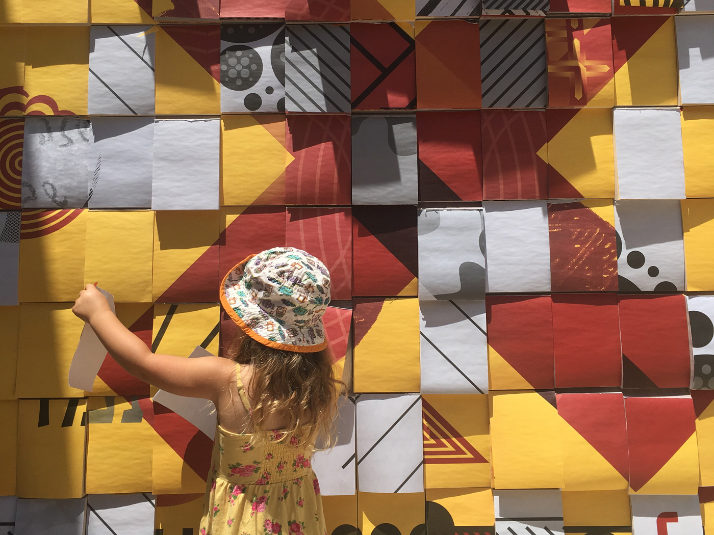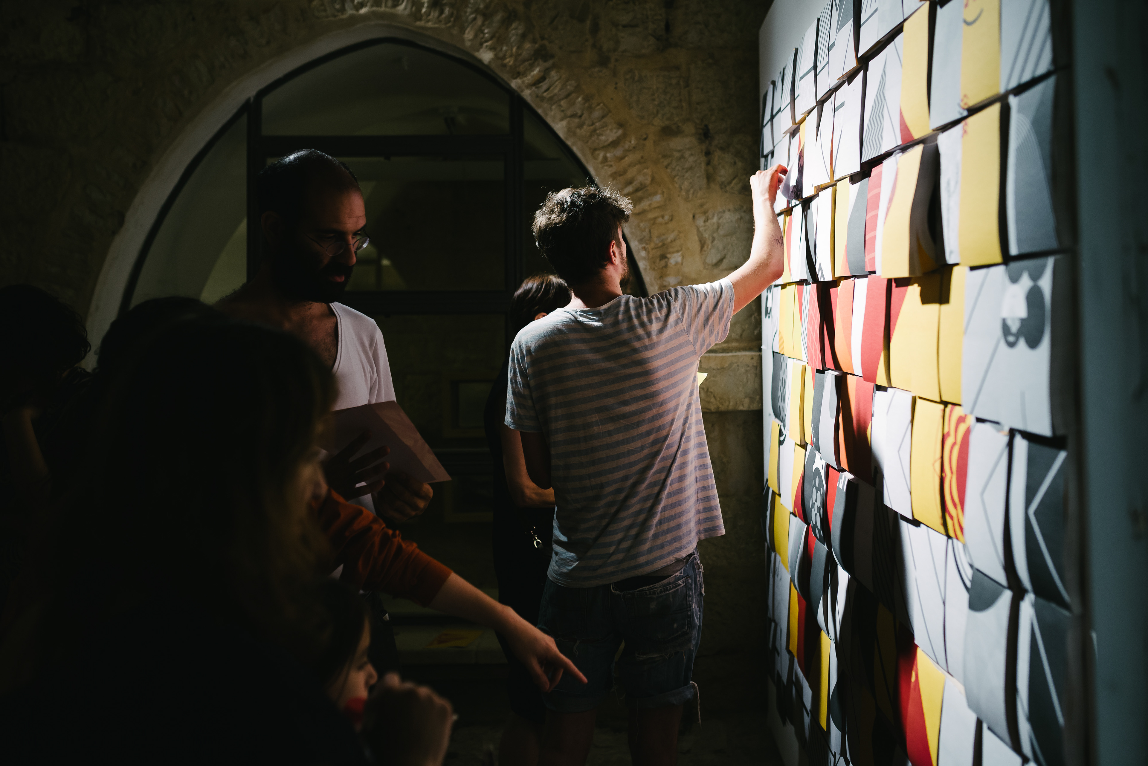 Faced with a new We Make Carpets creation made of pencils, a meticulous work of assembling individual items into one harmonious whole, Grotesca Design choose to reverse the process and dismantle dozens of images and messages in a random way, not knowing what the result will be, using 144 notepads full of images. While the carpet is in a delicate conversation with the audience and its existence depends on the separation from it, in Grotesca’s work the audience is invited to come and tear off any page they want; in fact, the work depends on this interaction. Together, both works echo an ongoing process of writing and erasing, revealing and covering.